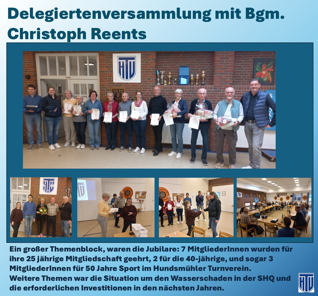 Auf der diesjährigen Delegiertenversammlung des Hundsmühler Turnvereins konnte Moderator Achim Posse zahlreiche Gäste sowie viele langjährige Mitglieder begrüßen. Ein besonderer Willkommensgruß galt dem Bürgermeister der Gemeinde Wardenburg, Christoph Reents, der die Versammlung begleitete und dem Verein mit wertvollen Hinweisen zur Seite stand.