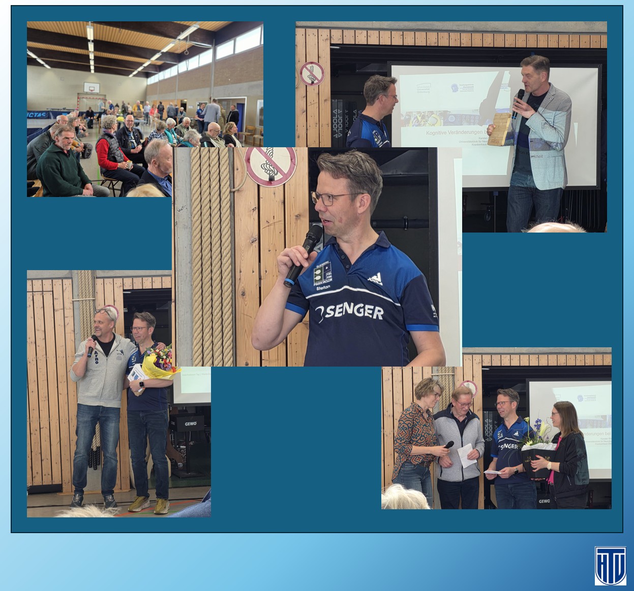 Am Samstag, dem 11.04.2026, fand in der Sporthalle Rosenallee eine gut besuchte Veranstaltung zum Weltparkinsontag statt. Der Ping-Pong-Parkinson-Stützpunkt Oldenburg, der beim Hundsmühler TV beheimatet ist, hatte unter der bewährten Leitung von Stefan Ganse ein interessantes Programm zusammengestellt. Gleichzeitig gab es Gelegenheiten zum Klönschnack bei Kaffee und Kuchen oder zum praktischen Ausprobieren an der Platte. Es wurde auch demonstriert, wie man durch eine Vorrichtung zur Sturzsicherung selbst mit Einschränkungen der Beinbeweglichkeit noch Tischtennis spielen kann.